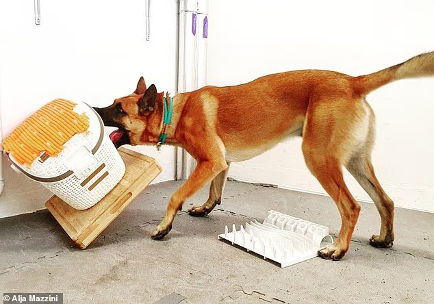 研究表明,一些狗表现出的行为类似于人类对玩具的行为成瘾。图为一只玛利诺犬试图将一个无法接近的玩具放入盒子中,而忽略了食物难题