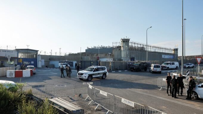 2025 年 10 月 13 日,安全官员在以色列奥弗军事监狱前行走,预计以色列将释放巴勒斯坦囚犯,这是哈马斯和以色列在加沙达成的人质和囚犯交换及停火协议的一部分,位于以色列占领的约旦河西岸拉马拉附近。图片来源:路透社
