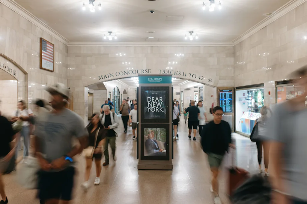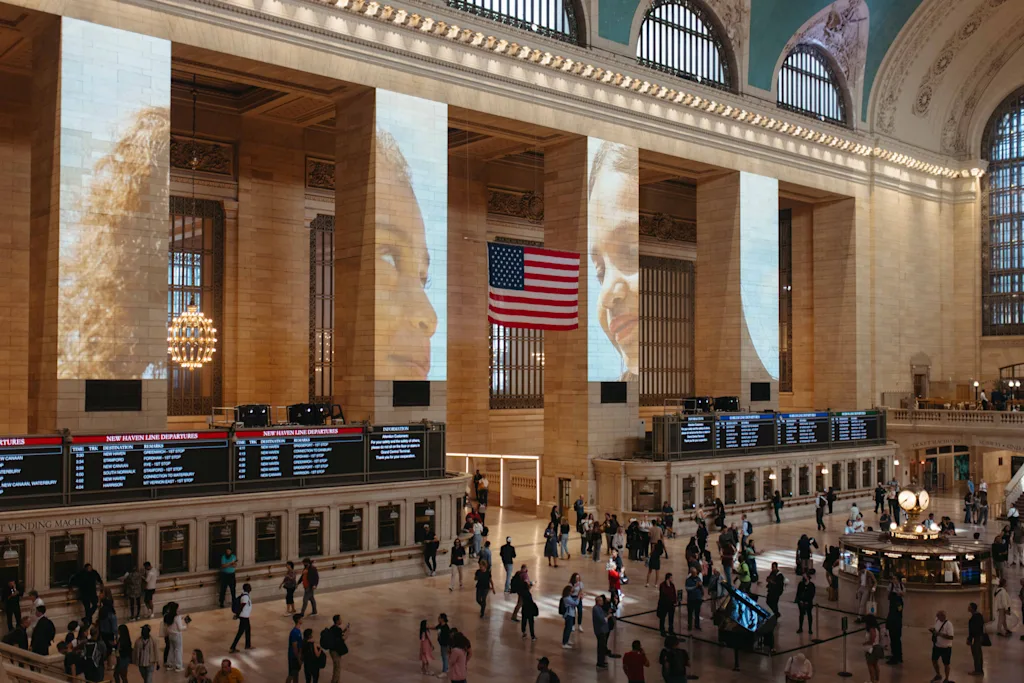 艺术现已延伸到中央车站的每个角落。在主大堂,50 英尺高的投影包裹着高耸的大理石拱门和柱子,让路人沉浸在这座城市的故事中。地铁隧道、楼梯和侧廊通过数百个数字屏幕变得栩栩如生,每个屏幕都捕捉日常生活的面孔、表情和片段。