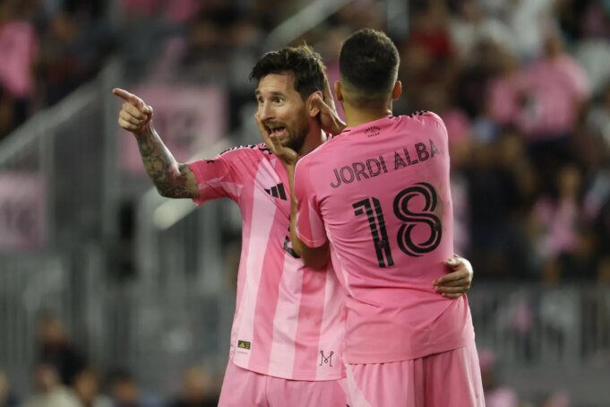 周六晚上,莱昂内尔·梅西与队友乔迪·阿尔巴一起庆祝他对阵亚特兰大联队和迈阿密国际队的第四个进球。